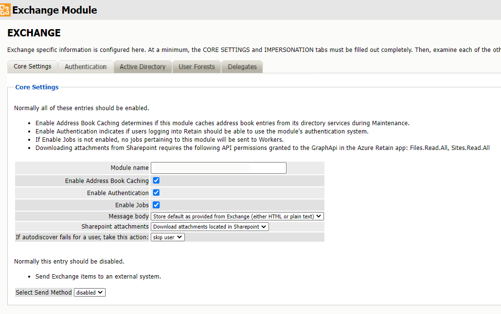 The Send Method lets you send Exchange items to an external system using FTP or SMTP. In most cases this should be disabled so that items are archived in Retain. To select the SMTP Forwarding or FTP features, you must first add and configure them in the Module Forwarding Tab on the Server Configuration page, otherwise the drop-down list is empty.