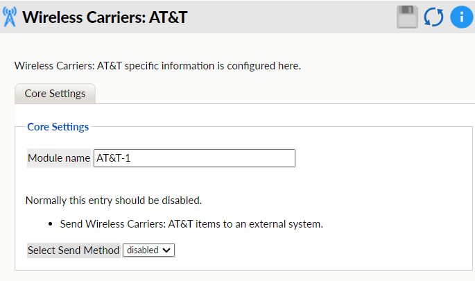 Path: Retain Server Manager > Configuration > Module Configuration > Wireless Carriers: AT&T-Configure > Core Settings