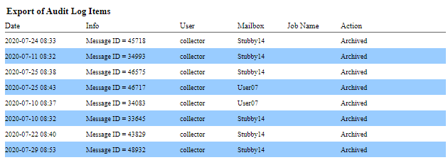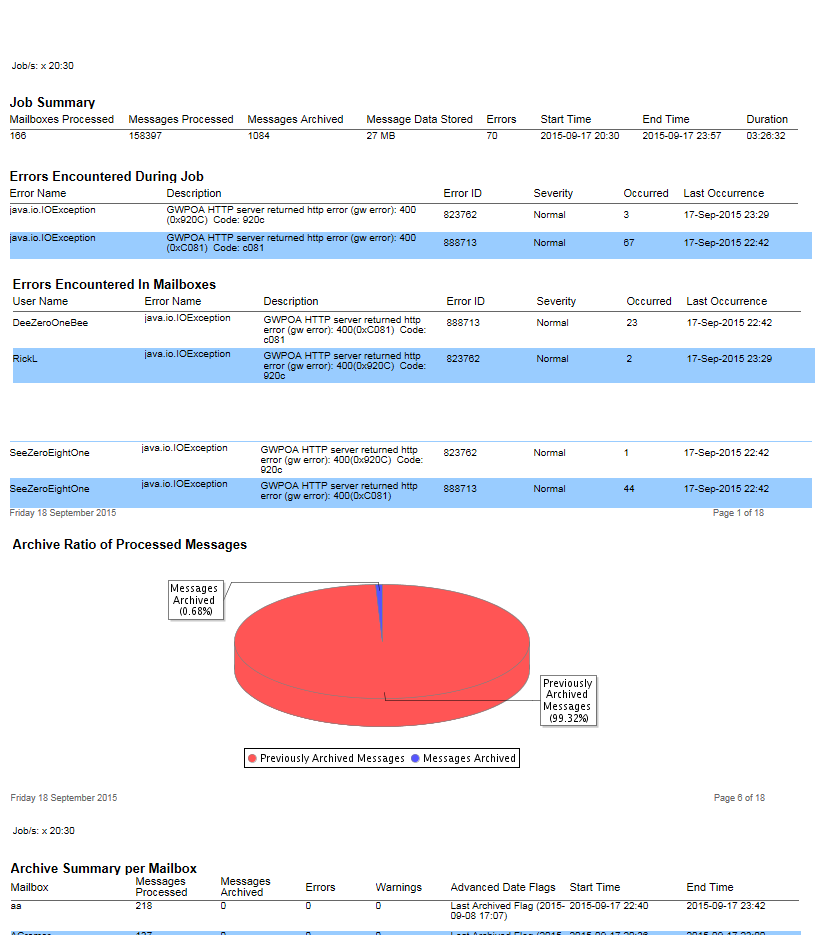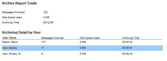 The Job Mailbox Summary report displays the number of messages archived, the disk space used, and the time the job took, by individual, specified mailboxes (users).