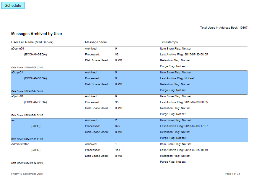 This report summarizes the archive history for selected users, including pertinent information for each mailbox over the previous 3 months.