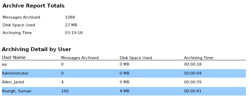 The report shows the user name, messages archived, disk space used, and archiving time for each mailbox as well as for the total job run.