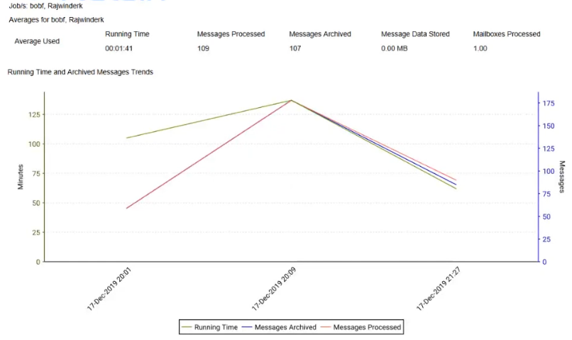 The summary displays the total mailboxes, messages, data store, errors, and running time of the job. Afterwards, this information is broken down by each mailbox the job covers.
