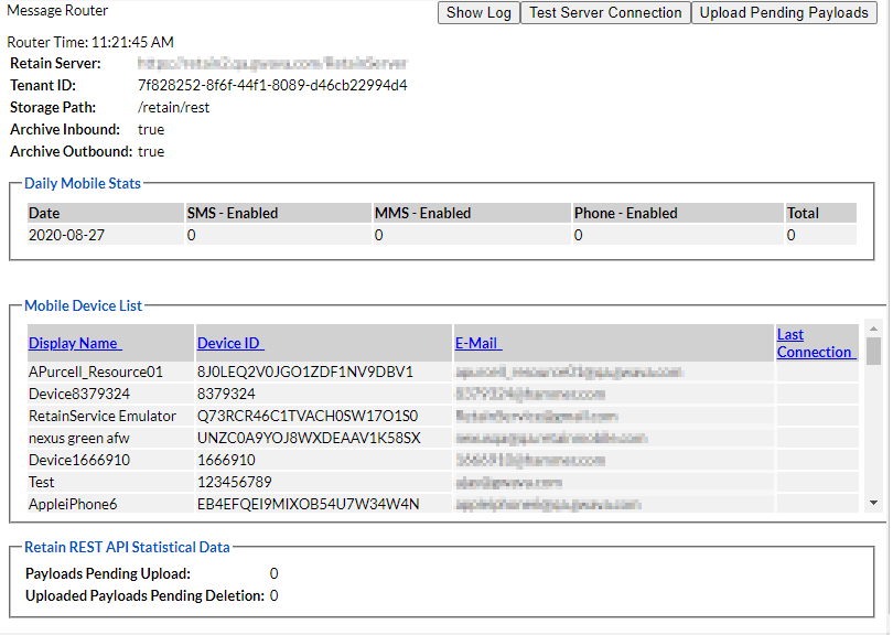 The Message Router console lets you view the devices that connect to Retain through the router and the state of temporarily stored communications (payloads) waiting to be transferred to Retain.