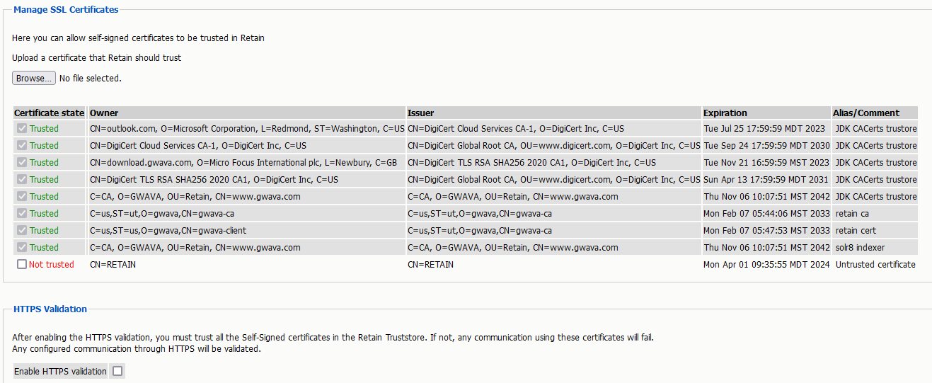 Secure communications requires Retain server to use industry-recognized Certificate Authorities and Self-signed certificates. On upgrading to Retain 23.2, when certificates are expired or become invalid, you are allowed to upload and manage new certificates.