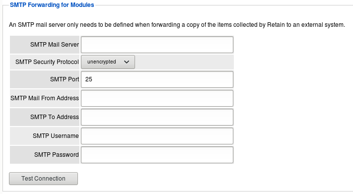 This feature is not recommended for use with any SMTP system which Retain is currently archiving. If Module Forwarding is enabled and configured to use the SMTP system which Retain is currently archiving, duplicate data will be archived; Mobile, Blackberry, and Social data will be doubled in the Retain archive.