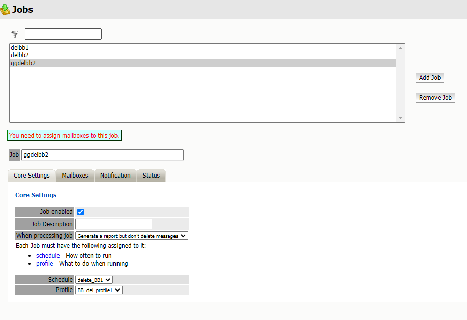 Core Settings allows you to choose between Generate a report but don't delete message and Delete messages as they are processed when processing the job.