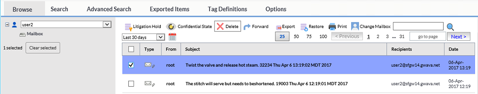 Within the users mailbox one or more messages can be deleted by selecting with the checkbox and pressing the Delete button.