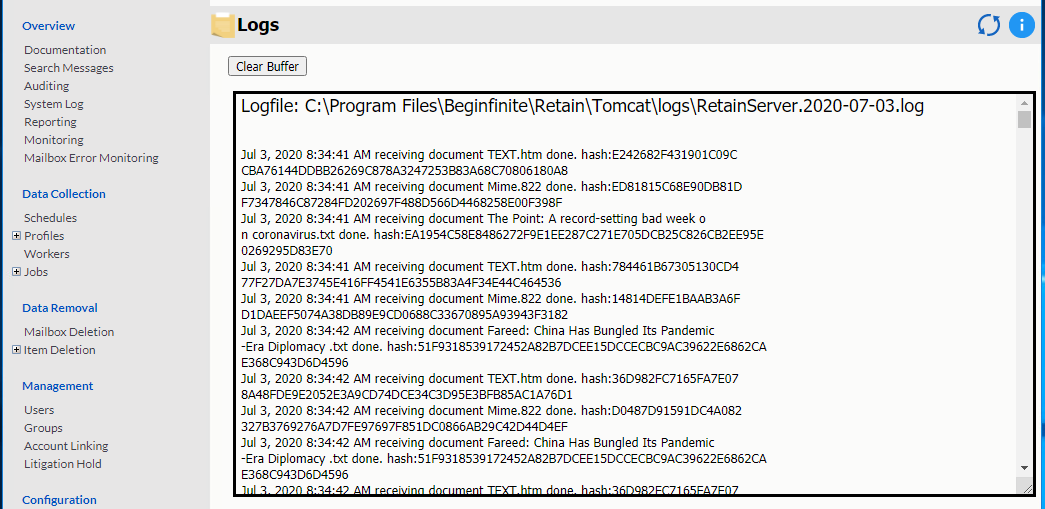 Linux: /opt/beginfinite/retain/tomcat8/logs