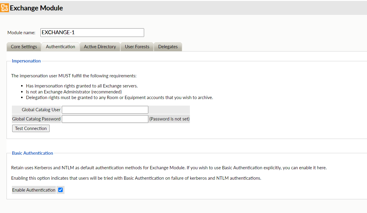 To enable Basic Authentication in the Exchange module, navigate to the Authentication page and select Enable Authentication under the Basic Authentication section. When configuring the Exchange module, Retain first attempts Kerberos authentication for enhanced security, and if the authentication fails, it seamlessly falls back to NTLM to ensure continued access. Retain switches to Basic Authentication when Kerberos and NTLM Authentication fails.