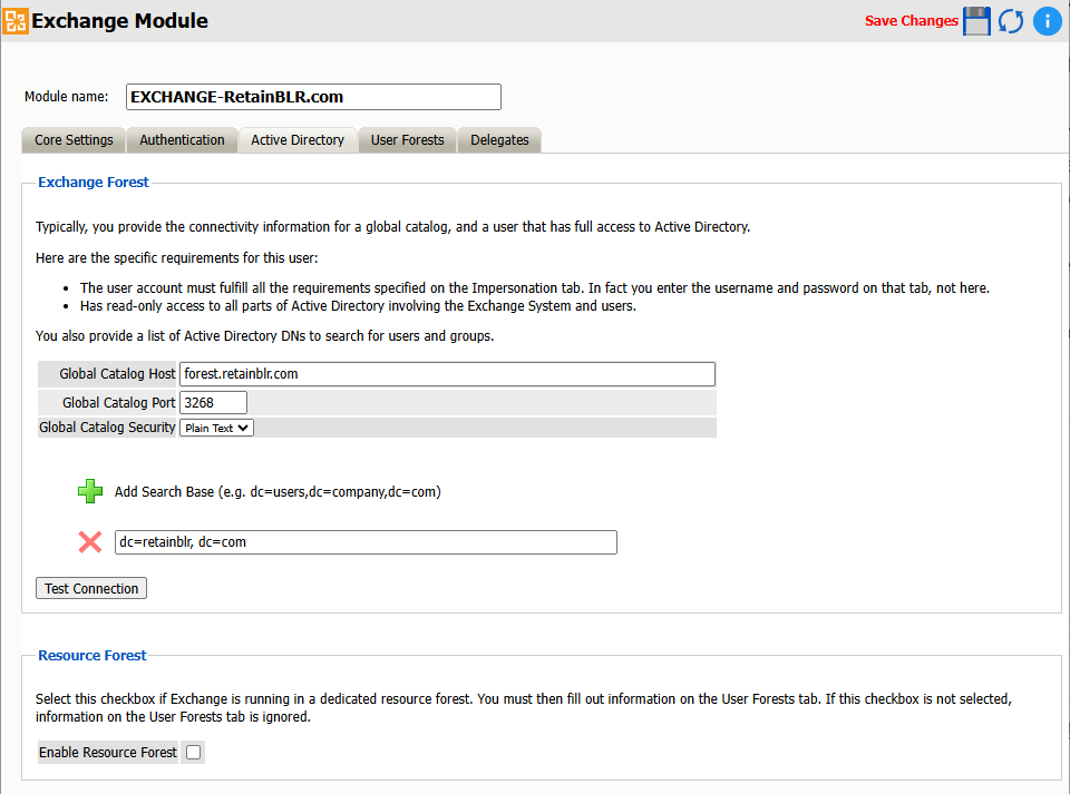 Retain does NOT support multiple linked Active Directorys. Ensure that the Exchange Settings have been configured correctly before continuing the Exchange module setup.