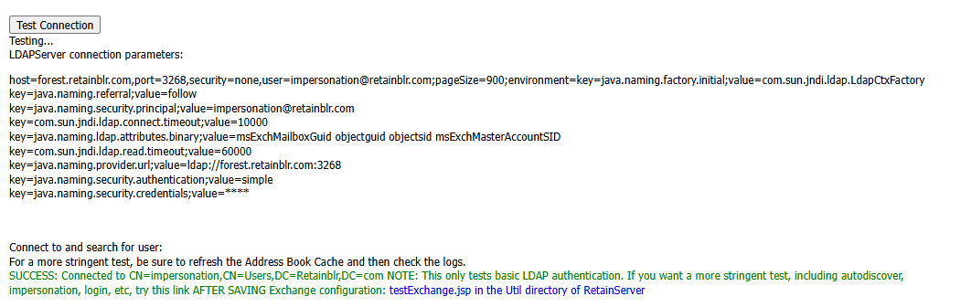After the Search Base has been added, test the connection to ensure information and connection works. The test performs a simple login to confirm that the user exists, the Exchange Server is reachable, and that the credentials are accepted. The test does not confirm impersonation or delegation rights necessary for the Service Account.