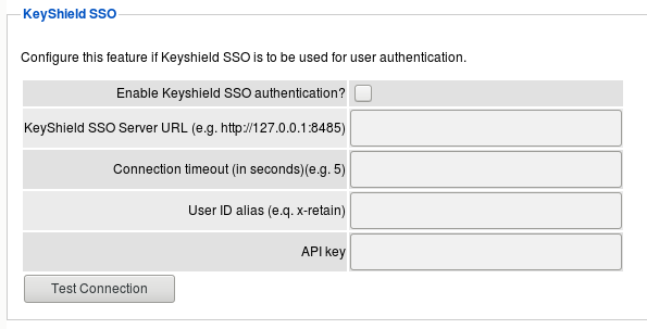 To use the KeyShield client in coordination with Retain, Retain needs to have an open connection to the KeyShield server, the User ID alias, and the API key. Specify the KeyShield SSO Server URL, Alias, and API key. The Timeout is set in seconds, and may be anything required, 5 is recommended. Test the connection to ensure proper function.