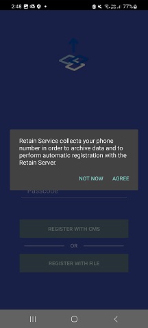 Open the RetainService application, If the application is unable to get the phone number from the SIM, it displays a popup to enter the phone number. Enter the phone number.