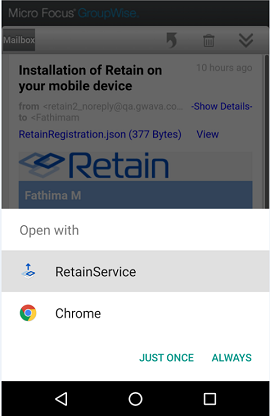Retain creates an email which contains an activating link. Users need to open this email and follow the link on their mobile device. The link should be activated through the Retain application on the Android device. Therefore, the RetainService application must be installed on the Android device prior to clicking the activation link.