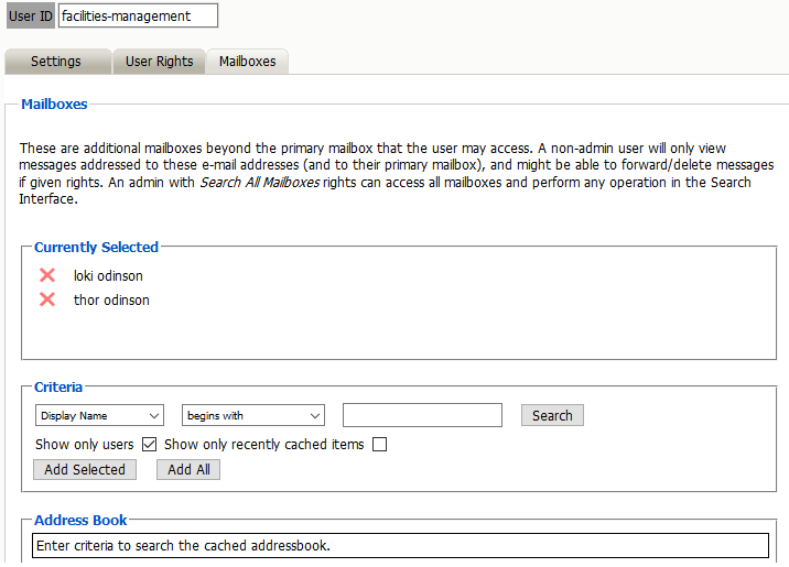 Adding users to the list is done using the Address Book selector. In the criteria section, you may enter information to search for a mailbox or a set of mailboxes. The search results will appear in the Address Book section. Each listed entry has a check box you can use to select that mailbox for addition to the list. Once you are done selecting, click Add Selected Items to add those mailboxes to your list of searchable mailboxes.