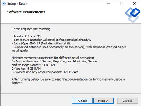 2. Run “RetainInstall.exe”. NOTE: If it already exists, the installer automatically shuts down Tomcat.
