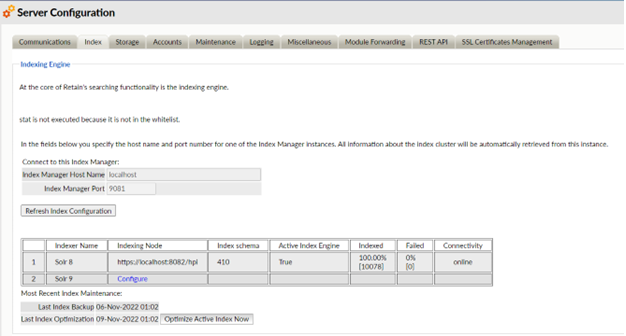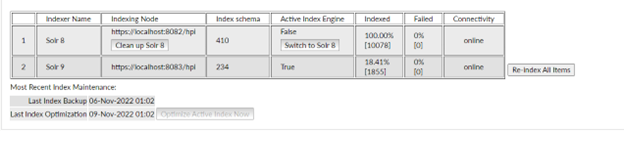IMPORTANT:Once Solr 9 is configured, index optimization and backup are disabled until Solr 8 clean-up is completed.