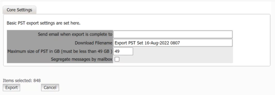 Message body size, the number of messages, the type of messages, the size of attachments that are included, and the number of recipients all factor in the PST file size. Retain doesn’t have this information before the export is created and therefore cannot estimate the exported file size.