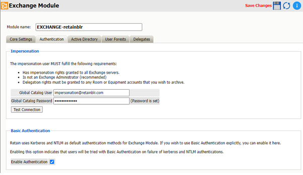 To enable Basic Authentication in the Exchange module, navigate to the Authentication page and select Enable Authentication under the Basic Authentication section. When configuring the Exchange module, Retain first attempts Kerberos authentication for enhanced security, and if the authentication fails, it seamlessly falls back to NTLM to ensure continued access. Retain switches to Basic Authentication when Kerberos and NTLM Authentication fails.