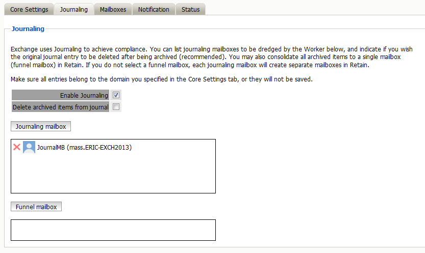 In order to achieve compliance, Exchange utilizes a Journaling mailbox. This mailbox can be set to be archived by retain to collect all messages on the system. The Journaling mailbox can rapidly grow in size if it is not cleaned out after messages have been archived. The Journaling option for Exchange jobs allows Administrators to set whether Retain will automatically clean out messages from the Journaling mailbox which have been archived.