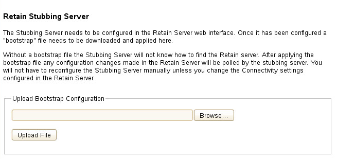 Browse to http://<Retain_Stubbing_Server_Address>/RetainStubServer or http://<Retain_Stubbing_Server_Address>:48080/RetainStubServer and upload the bootstrap.