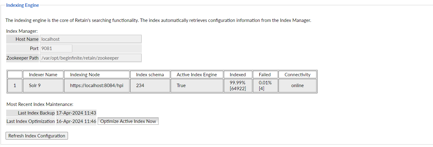 Path: Retain Server Manager > Configuration > Server Configuration > Index Tab > Indexing Engine Panel