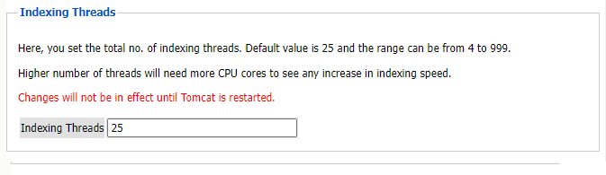The default indexing thread value is 25. You can modify indexing thread value to any range between 4 and 999. Ensure that you restart the Tomcat service to apply the modified value range indexing threads.
