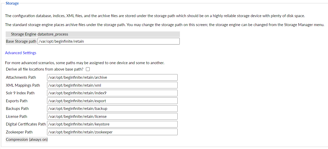 Sets the default path for where the Retain archive, XML files, search index files, PDF exports, backups, and license files are stored. Customized paths for these can be set by clicking the Advanced Settings link and deselecting the Derive all file locations ... option. |