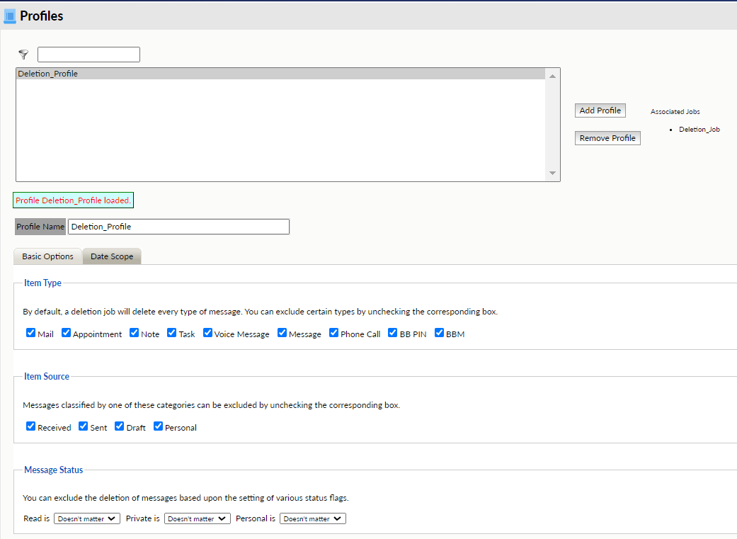 The profile sets the type and age of the items to be deleted.