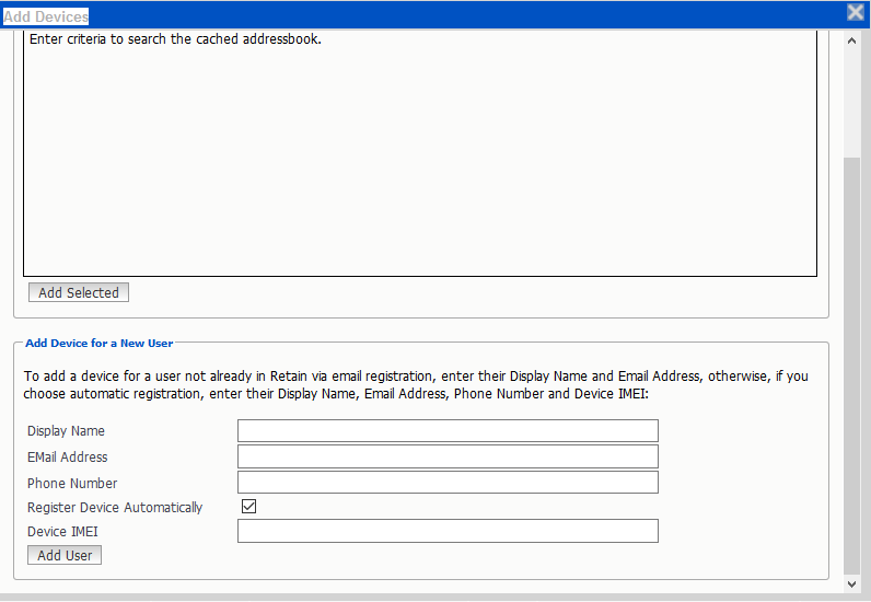 You can also add users which are not cached in the Retain system, but they must be added one at a time by manually entering the display name, email address, phone number and device IMEI associated with each device.