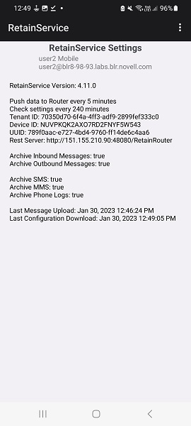 Automatic registration is done through our Cloud Mobile Service (CMS). This registration method requires no end user intervention and ideally, the user should not be aware of the registration process. Automatic registration requires four mandatory values to be provided in the device management page at the time of registration: display name, email address, phone number and IMEI number. Before attempting an automatic registration, ensure that the RetainService application is installed on the Android device.
