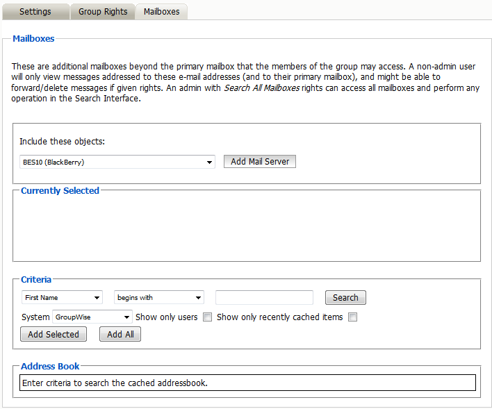 • You use the address book selector to choose which mailbox or mailboxes to give the group access to.