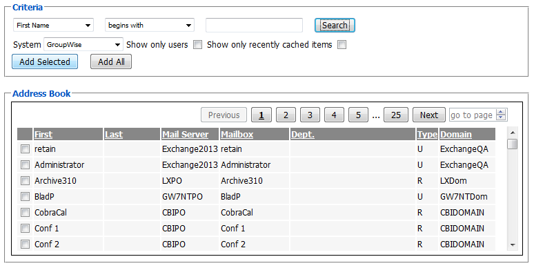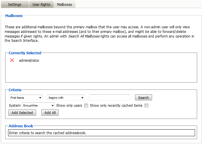 Adding users to the list is done using the Address Book selector. In the criteria section, you may enter information to search for a mailbox or a set of mailboxes. The search results will appear in the Address Book section. Each listed entry has a check box you can use to select that mailbox for addition to the list. Once you are done selecting, click Add Selected Items to add those mailboxes to your list of searchable mailboxes.