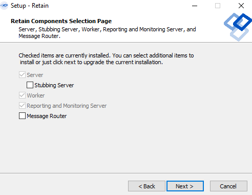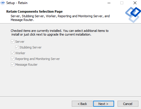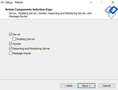 Select the program features to install. (Retain Server, Stubbing Server, Retain Worker, Reporting and Monitoring Server, and the Message Router.)