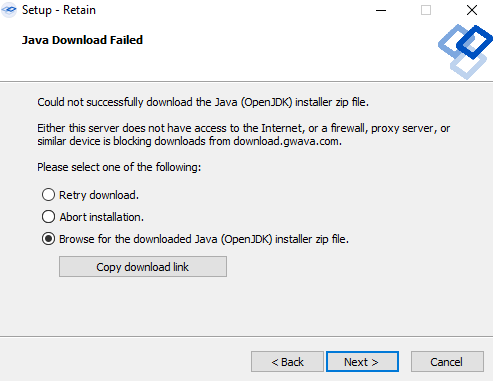 If an Internet connection cannot be made, the installer asks whether to retry, to abort, or use a local path to the Java installation package. You can download the correct version of the Java installer for Windows here.