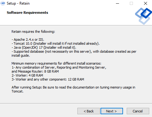 Java and Tomcat are installed or upgraded. (Note: If there are issues with Apache and Tomcat starting correctly, set the Java initial memory pool and the maximum memory pool to the same value, appropriate to the system and expected load.) Tomcat is run as a System Service and shows up in the system services list as “Retain Tomcat 10.1”. (Start | Run | services.msc)