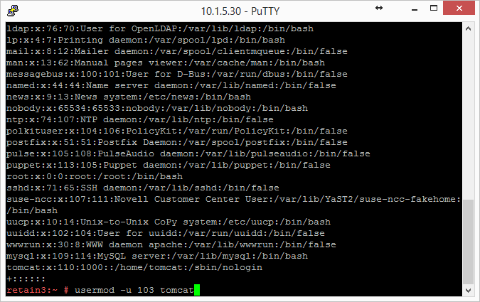 This lists all the user accounts on the server, showing their userids and group IDs. In the list in the screenshot, tomcat is listed last and its userid is 110 and its group ID is 1000.