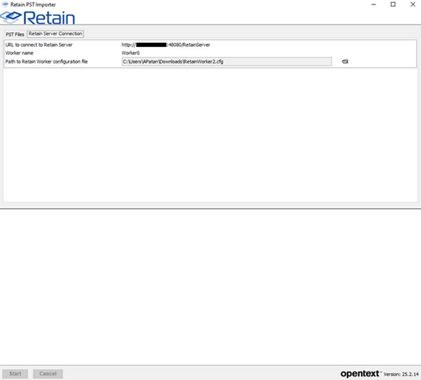 On initial startup, the Retain PST Importer opens to the configuration page. The worker configuration file contains all the connection information for the Retain Server. (If the location changes, the worker configuration file will need to be re-downloaded.)