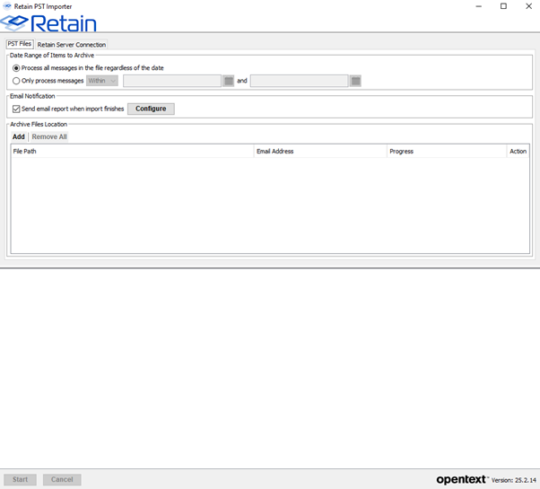 The Retain PST Importer is a tool which inputs mail from PST archives into the Retain system. The PST Importer is a utility which is installed on a Windows machine, local to the PST archive and works in coordination with the Retain Server.