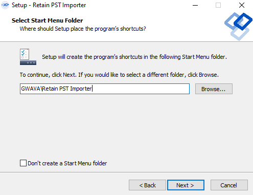 The PST Importer may be installed with a shortcut in any desired start menu folder. The default folder is displayed. Change as desired and select ‘Next’ to continue.