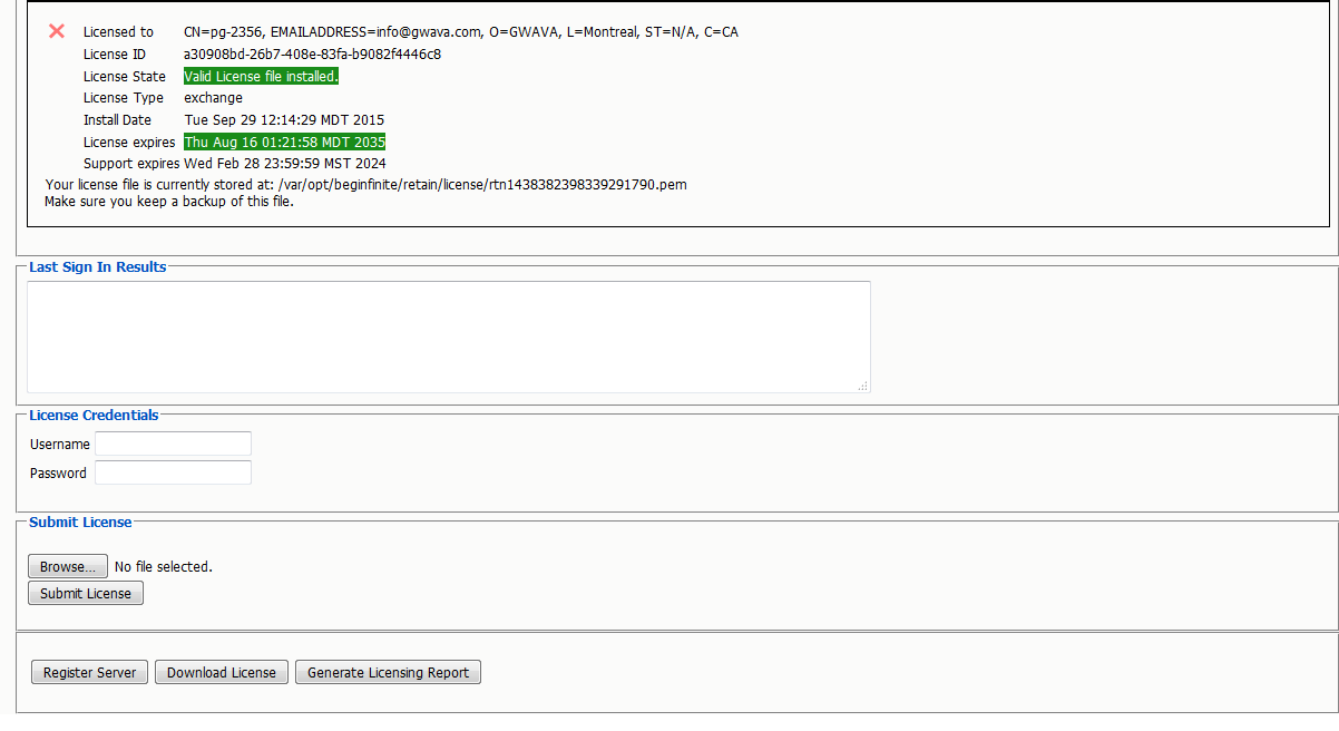 To upload a new license, browse to the bottom of the page and Select ‘Browse’ from the ‘Submit License’ section. Browse to and select the desired license file, and then select ‘Submit License’. The new license will be added to the system. Logout and re-login to the server to see the license in effect.