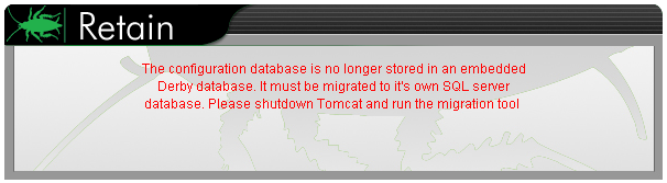 The configuration database is no longer stored in an embedded Derby database. It must be migrated to it's own SQL server database. Please shutdown Tomcat and run the migration tool.