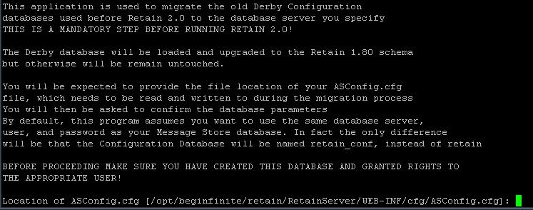 The migration program will inform you of what it will do and what information is required. The ASConfig.cfg file is located in the …/retain/RetainServer/WEB-INF/cfg directory.