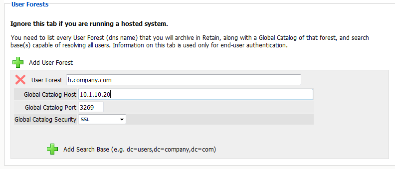 Select the green ‘+’ button and input the LDAP information required by the Forests’ Global Catalog server: IP address or hostname, port, security, (SSL is strongly recommended), and all search bases to include all the users. No administrative credentials are required. Each end user’s provided credentials will be used on login.