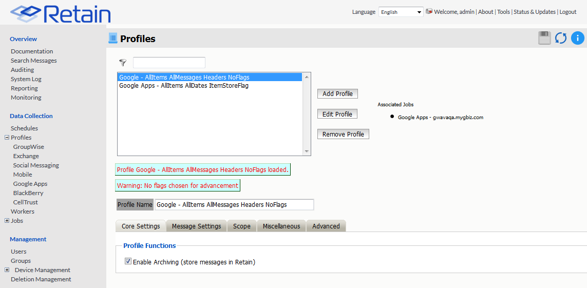 To create a profile to archive email and data from Google Apps, select the add profiles button and name the profile then continue configuring as desired. The Google Apps profile must be configured and all settings saved before a job can be created and run.