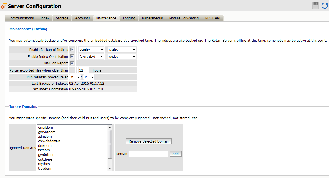 The settings for the Communications tab are set in the initial setup of Retain. These include the connection to the SQL Database server, the REST and Router connection information, and the notification or SMTP information. If any changes in the system or corrections are needed, they should be configured here.