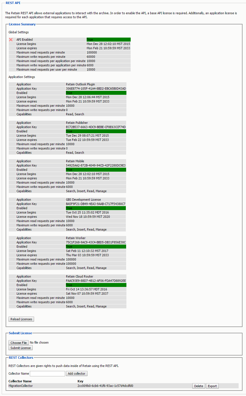The REST API is an interface built into Retain which allows third-party applications to input data into the Retain archive. This API was developed to open new horizons to the Retain Archive for any application which conforms to the API requirements. Because of the access the API grants to applications, an additional API license file is required for each application. This license contains credentials and access rights. In order for a third-party application to utilize the REST API, the application must have a credentialed key provided by Micro Focus.