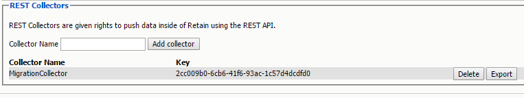 Export the collector allows you to export the Key and Secret to disk for use with the message system.
