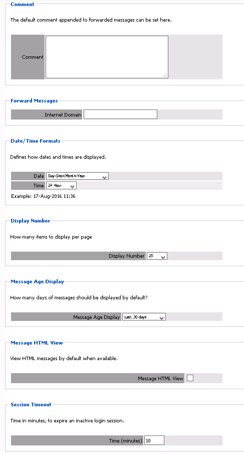 All user level rights are strictly optional, and add functionality. None are needed to access your own mailbox and other mailboxes assigned to you. The "Default" group grants Forwarding, View Attachment, and Printing rights. Note: There is no way to perfectly block printing in a web browser, so using this feature should not be taken as a 100% guarantee that users won’t be able to print. Nonetheless, for most users, it is effective. Rights marked [other mailbox] refers to other mailboxes the user has been granted rights to as explained below for the Mailboxes tab.