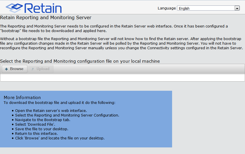Like the Retain Worker, the R&M server must be uploaded a saved configuration or ‘bootstrap’ file. To access this tab, the configuration must be saved first. Then the bootstrap tab will become available. Download the file to a known location and then browse to the R&M server webpage. The default connection address is shown on the connection tab.